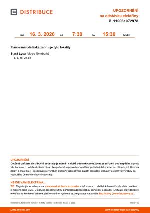 Společnost ČEZ oznamuje, že dne 16.3.2026 od 7:30 - 15:30 hodin dojde k přerušení dodávky elektřiny u č.p. 16,20,51.