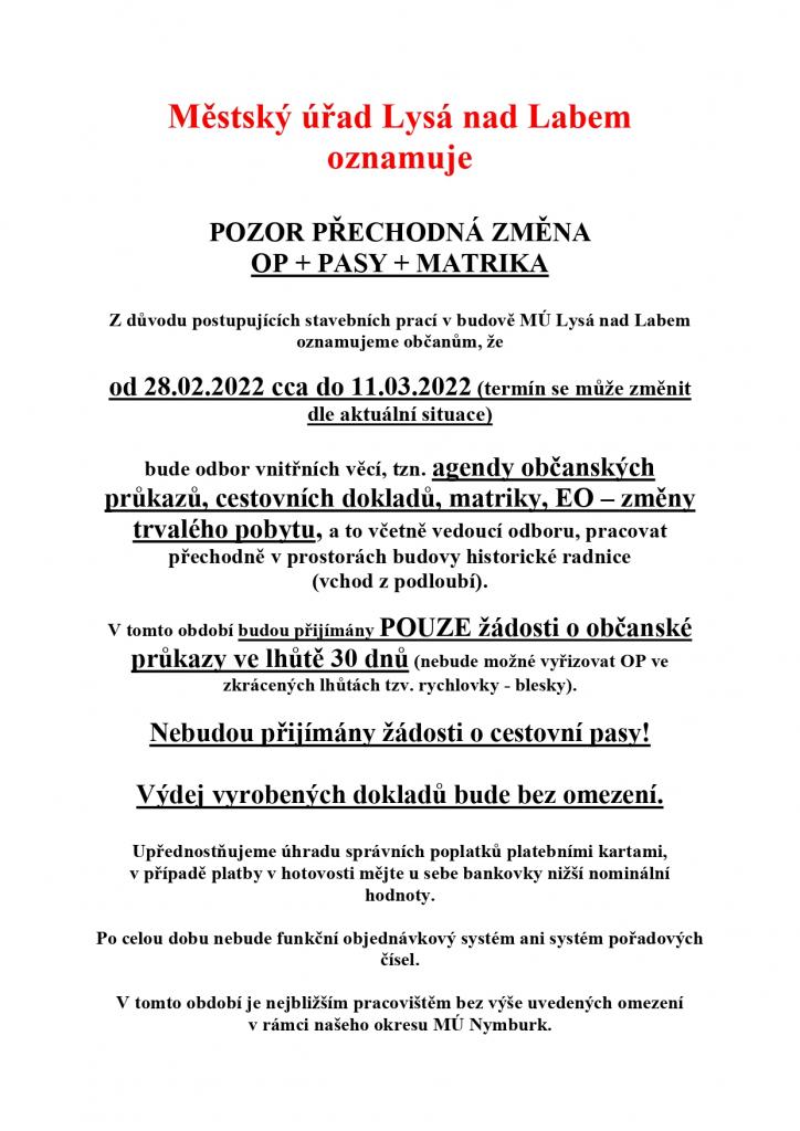 Městský úřad Lysá nad Labem - POZOR PŘECHODNÁ ZMĚNA OP + PASY + MATRIKA